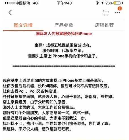 今天古鋒網(wǎng)小編在逛淘寶的時(shí)候突然發(fā)現(xiàn)了一個(gè)神奇的寶貝,“老外代報(bào)案找回丟失的蘋果”?。?br />